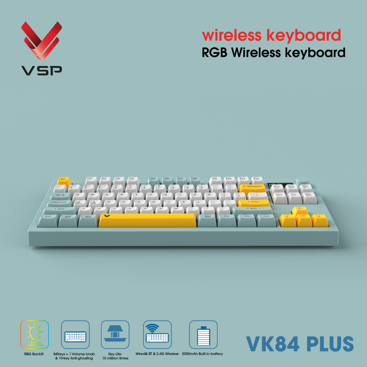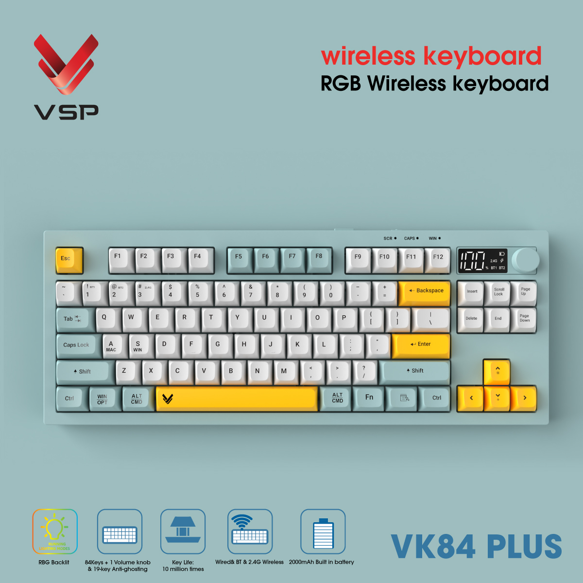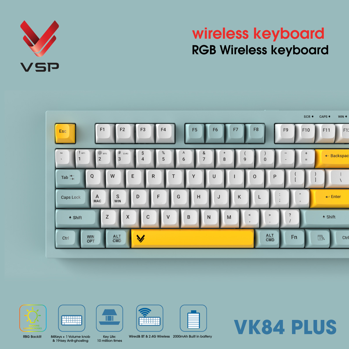 Bàn Phím Không Dây 3 Chế Độ VSP VK84 Plus không chỉ là một bàn phím, mà là trợ thủ đắc lực cho game thủ muốn chinh phục mọi tựa game. Thiết kế nhỏ gọn, tính năng đa dạng và đèn nền RGB sống động - tất cả gói gọn trong một sản phẩm bền bỉ, tiện dụng.