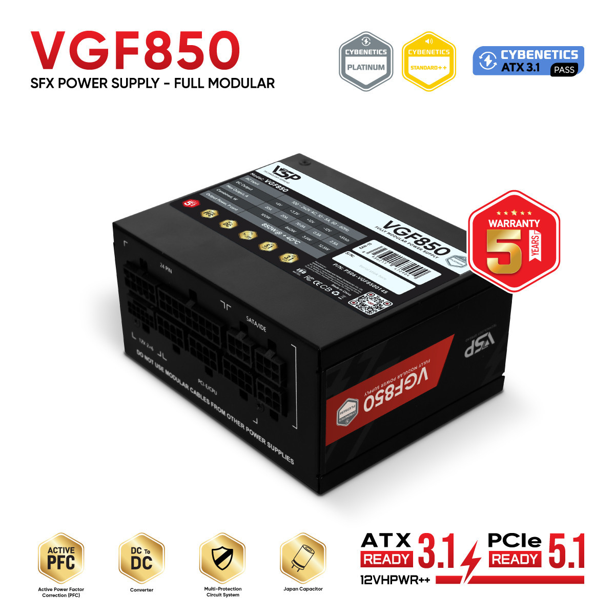 Nguồn VSP VGF850 (850W | Chuẩn SFX / Cybenetics Gold | Fully Modular | ATX 3.1 & PCIe 5.1)