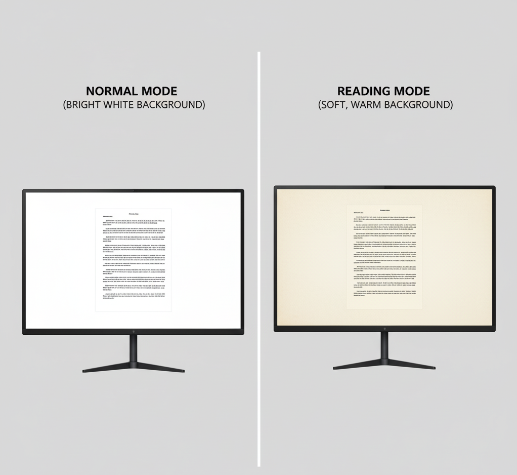 - Reading Mode (Chế độ đọc sách): Giảm độ sáng, chuyển màu sang tông ấm (sepia) hoặc đen trắng để giả lập giấy E-ink, giúp đọc văn bản dài hàng giờ mà không mỏi mắt.