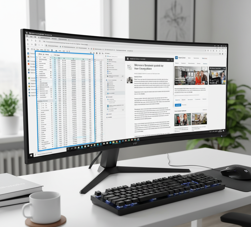 - 21:9 (Ultrawide - Siêu rộng): "Vua đa nhiệm". Một màn hình 34 inch Ultrawide có thể thay thế hoàn toàn 2 màn hình 24 inch ghép lại. Bạn có thể mở song song 3-4 cửa sổ (Excel, Word, Web) mà không cần Alt-Tab.