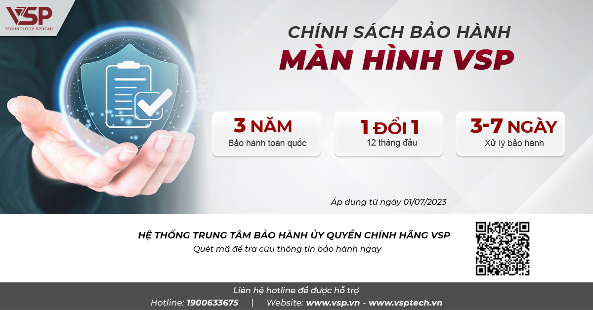 Khi mua màn hình VSP, bạn không chỉ mua sản phẩm mà còn mua sự an tâm với chính sách bảo hành 36 tháng và hỗ trợ 1 đổi 1 nhanh chóng. Đừng đánh đổi sự yên tâm trong 3 năm chỉ để tiết kiệm vài trăm ngàn ban đầu.