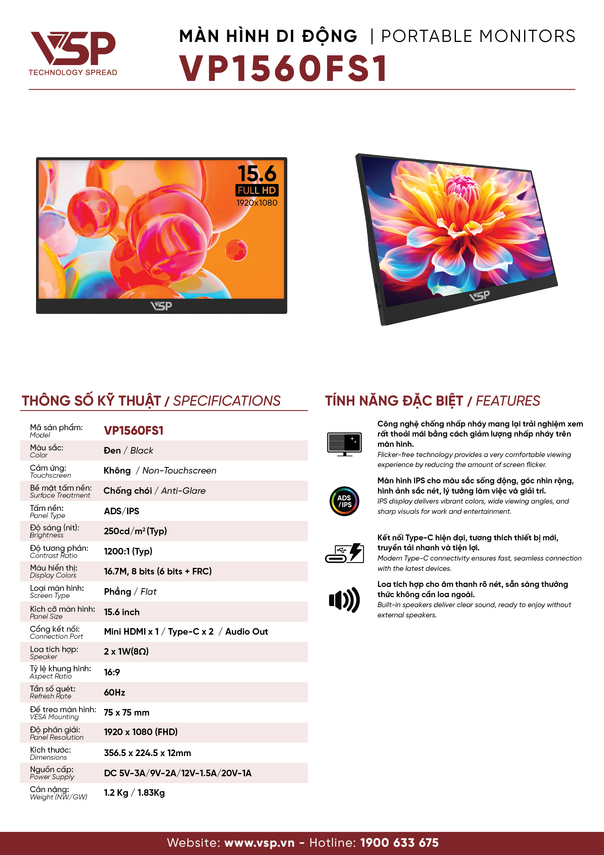 Màn Hình Portable VSP VP1560FS1 (15.6inch / IPS / ELED / FHD / 62Hz / non-Tooth)