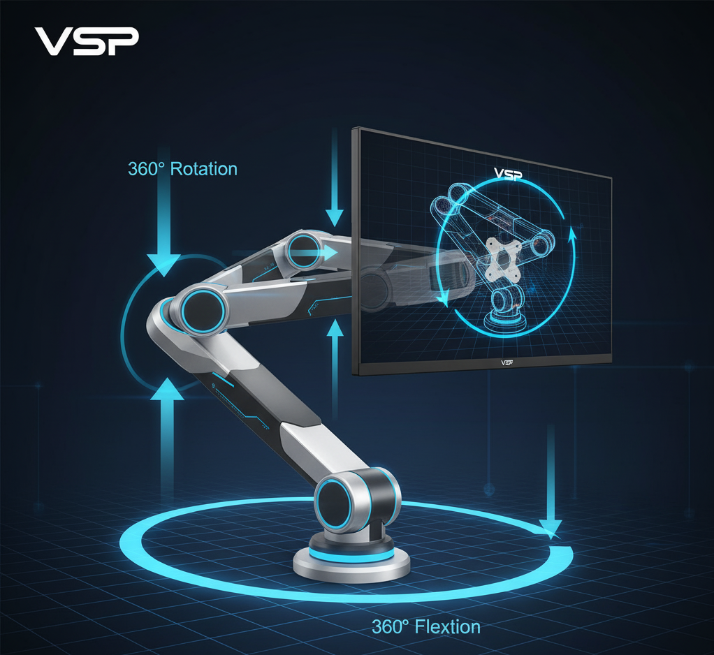 - Tải trọng khủng: ARM VSP được thiết kế từ hợp kim nhôm chịu lực, có thể nâng đỡ các màn hình Gaming nặng từ 2kg đến 9kg (thậm chí 12kg với các dòng chuyên dụng).