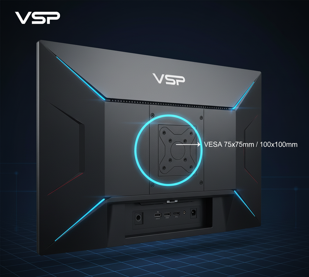 - Lưu ý đặc biệt (Pro-tip): Hầu hết màn hình VSP (VG Series, VU Series, IP Series) đều hỗ trợ VESA. Tuy nhiên, nếu màn hình của bạn có vị trí ốc bị lõm sâu vào trong, bạn sẽ không thể gắn trực tiếp ngàm ARM vào được. Lúc này, hãy tìm bộ ốc đệm (Spacers) và ốc dài (thường được VSP tặng kèm sẵn trong hộp ARM) để "độn" ngàm lên.