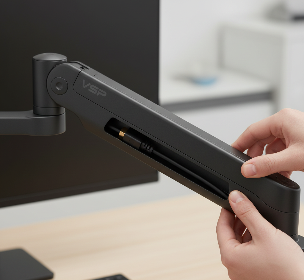 Tay nâng VSP được thiết kế với tư duy thẩm mỹ cao, tích hợp sẵn hệ thống khoang giấu dây (Cable Management Channels) dọc thân: