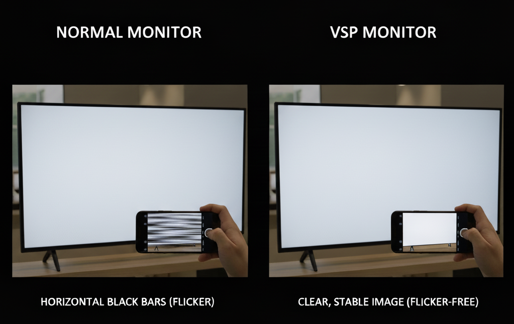 - Giải pháp VSP (DC Dimming): Màn hình VSP đạt chuẩn TÜV sử dụng công nghệ DC Dimming (Dòng điện một chiều). Đèn nền luôn sáng ổn định, không hề có chu kỳ bật/tắt, giúp loại bỏ hoàn toàn hiện tượng nhấp nháy ở mọi mức độ sáng.