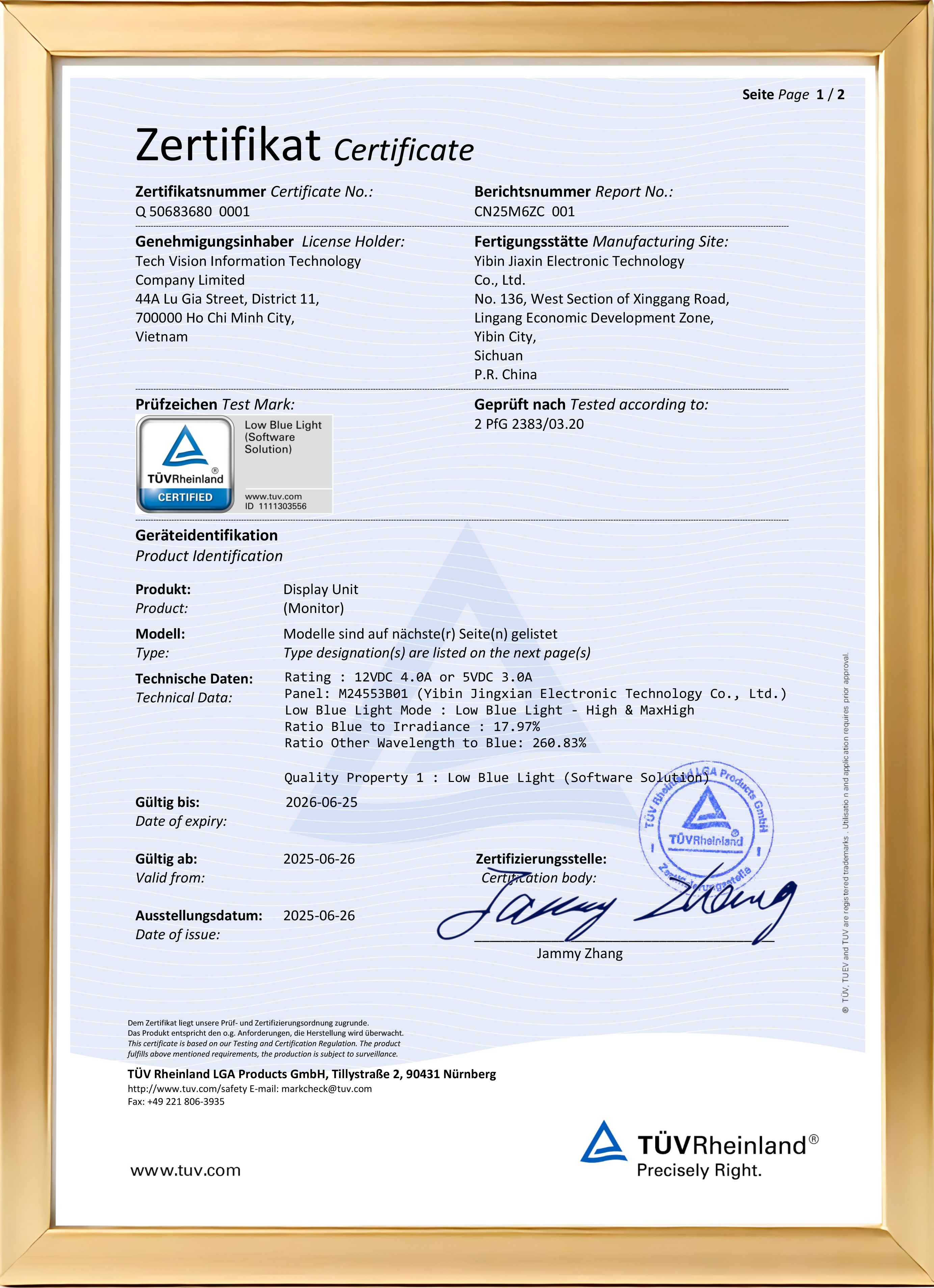 Không chỉ là lời nói, dưới đây là các chứng nhận thực tế mà các dòng màn hình VSP đã vinh dự nhận được từ TÜV Rheinland:
