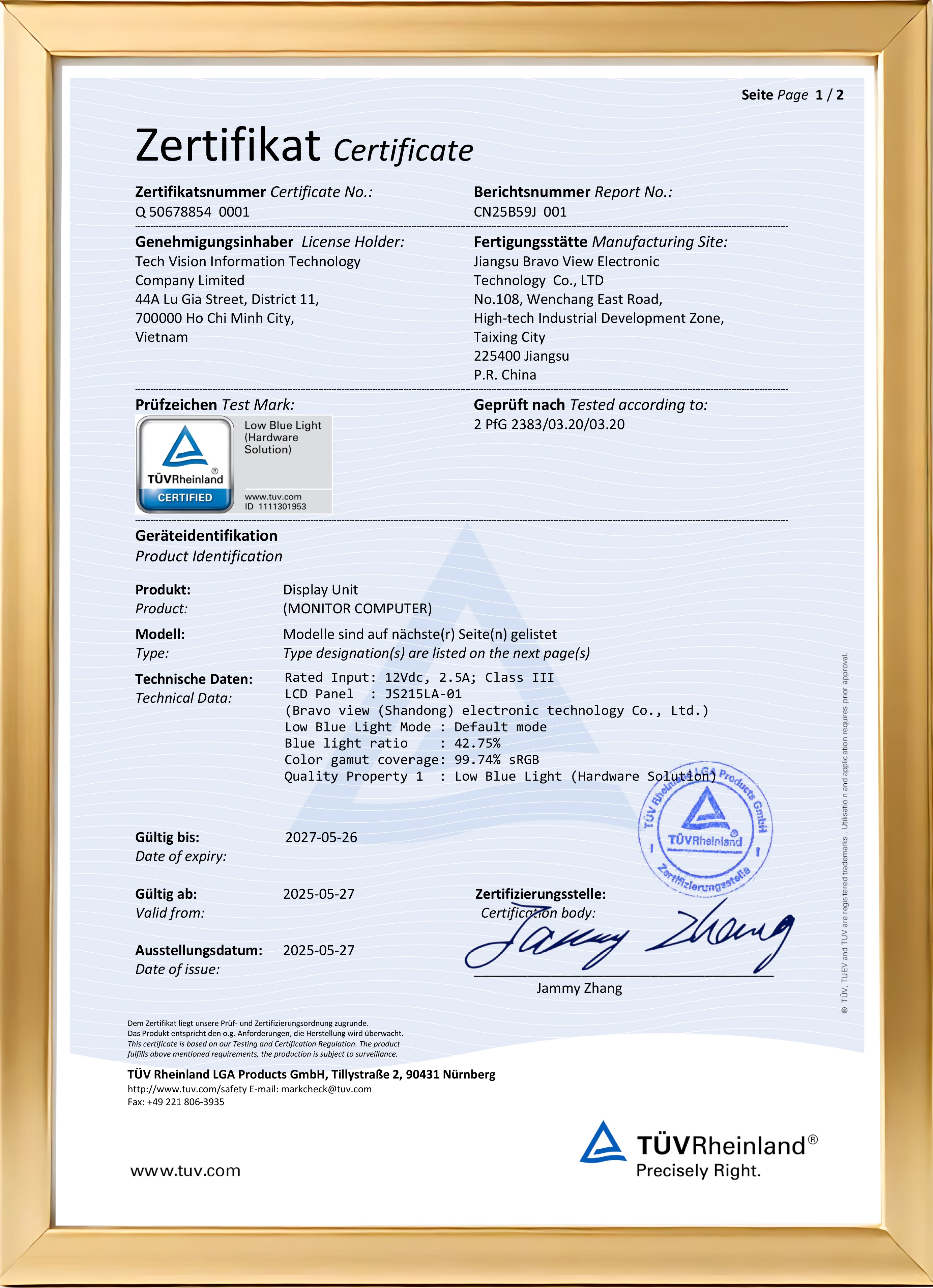 Chứng nhận TUV được Technischer Überwachungsverein công bố giải pháp hạn chế ánh sáng xanh bằng phần cứng "Low Blue Light Hardware Solution" cho màn hình VSP