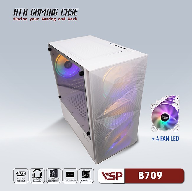 Vỏ Case Máy Tính VSP Gaming Mid Tower B709 - Trắng + 4Fans Led
